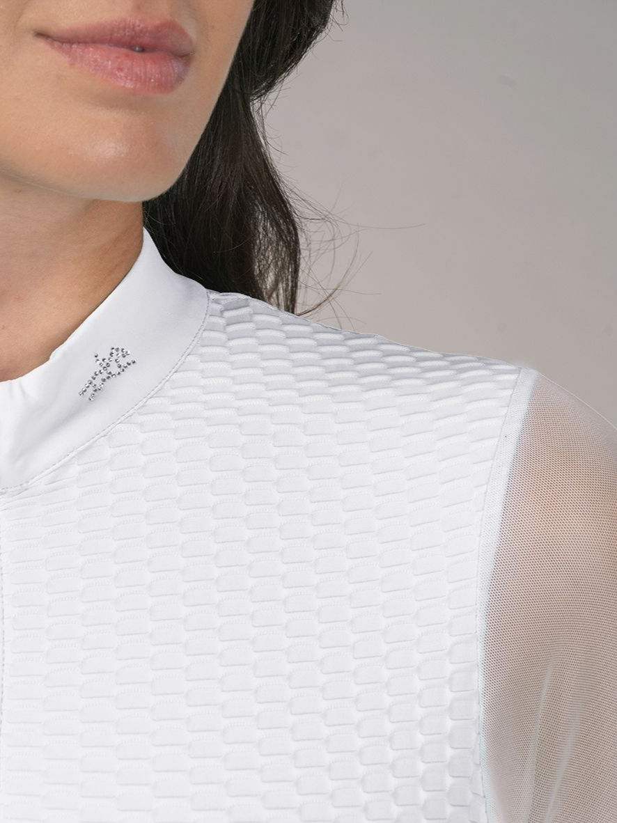 The Cavalleria Toscana kid’s competition shirt is designed to provide comfort and style during events. Made from breathable, stretch technical jersey, it ensures freedom of movement and a flawless fit. The white poplin bib adds a touch of elegance, while the hidden press-stud buttons and the collar finished with an embroidered CT logo complete the refined design. Perfect for young riders looking for a technical yet sophisticated garment for competitions.